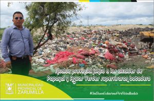 El alcalde de la municipalidad provincial de Zarumilla, acompañado de los señores regidores y con la presencia de los alcaldes distritales de Papayal y Aguas Verdes, realizaron la supervisión de los trabajos de mantenimiento y mejoramiento que se vienen ejecutando en el mencionado lugar. Los burgomaestres presentes, se comprometieron en realizar continuas visitas para verificar que los vehículos recolectores, arrojen la basura en el interior del botadero, evitando así que los residuos sean dejados en el ingreso al lugar, dando un mal aspecto a la vía que conduce al interior de la provincia. De esta forma, de manera conjunta, nuestras autoridades se unen para mejorar las condiciones medioambientales de este botadero, esperando la muy pronta ejecución del proyecto del relleno sanitario, para acabar con este álgido problema que afecta a nuestra población.