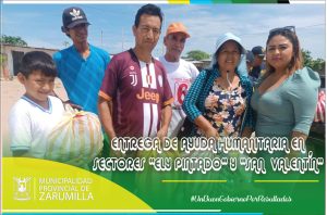 El alcalde provincial, Christhian Aguayo Infante, en coordinación con la regidora Kelly Zapata Gómez, realizó la entrega de ayuda humanitaria a los vecinos de los sectores “Ely Pintado Córdova” y “San Valentín”, quienes recibieron y agradecieron el gesto de nuestra primera autoridad edil. La comitiva estuvo acompañada en todo momento por personal del cuerpo de serenazgo y Policía Nacional. Este tipo de ayuda, se continuará entregando en los sectores menos favorecidos de nuestra provincia. Estamos trabajando por nuestra población.