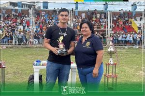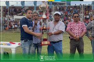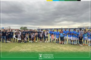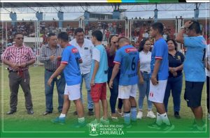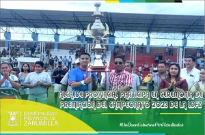 El alcalde provincial, Cristhian Aguayo Infante, en compañía de las regidoras Kelly Fiorella Zapata Gómez, Adriana Gisselly Canales Pineda y Carmen Tatiana Antón Cruz, participaron de la ceremonia de premiación a los equipos que representarán al distrito de Zarumilla, en la etapa provincial “Copa Perú – 2023”. Se les entregó un trofeo al club social deportivo “Ferrocarril” como campeón y el club “Halcones del Norte” como sub campeón de la Liga Distrital de Fútbol de Zarumilla. Nuestra primera autoridad edil, entregó el trofeo de campeón 2023, al capitán del equipo del CSD “Ferrocarril” y se impuso las respectivas medallas a los jugadores de ambos clubes.