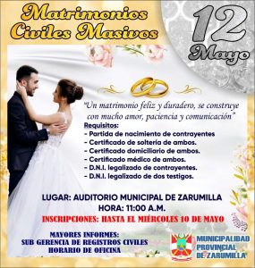 El alcalde de Zarumilla, Christhian Aguayo Infante, en coordinación con La Sub Gerencia De Registros Civiles, Invita A Las Parejas Que Deseen Formalizar Su Situación Conyugal, a participar de la ceremonia de matrimonios civiles masivos a realizarse el día viernes 12 de mayo desde las 11:00 a.m, en las instalaciones del auditorio “Julio Salvador Izquierdo Puell”.