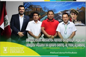 El alcalde de la Municipalidad Provincial de Zarumilla, Christhian Aguayo Infante, sostuvo una importante reunión con el Gerente de ENOSA – Tumbes Gustavo Ramírez Ruiz, representante de la empresa VIETTERL PERU S.A.C Ing. Víctor Tezén Castro y el Ing. Guillermo Aliaga coordinador del Proyecto PRONATEL EPAD TUMBES por parte del Ministerio de Transporte y Comunicaciones, donde se coordinó la facilidad por parte de ENOSA para acceder a la electrificación, el trabajo en conjunto para la instalación de WI-FI gratis, en beneficio de la población, contando con 8 puntos de acceso en las localidades de JOSE ABELARDO QUIÑONES, ISLA NOBLECILLA, LA TOTORA, QUEBRADA SECA, LECHUGAL, PUEBLO NUEVO, QUEBRADA GRANDE (ALAN GARCIA) y EL BENDITO. Dicho proyecto, es financiado por el MTC con un costo de un aproximado de 12 millones de soles siendo costo 0 para nuestra Comuna, el cual servirá para alimentar los equipos de telecomunicaciones, pozo tierra, entre otros en un área de 15.6m² con coordenadas. Estamos trabajando por el progreso de nuestra provincia.