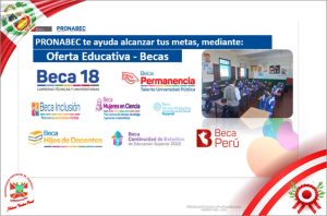 Con la finalidad de impulsar una mayor participación de los jóvenes, así como demostrando compromiso por el desarrollo educativo en nuestra provincia, el Programa Nacional de Becas y Crédito Educativo – PRONABEC, en el marco del presente año 2023, se viene realizando diferentes convocatorias de Beca 18, Beca Hijo de Docentes, Beca Continuidad de Estudios, Beca Bicentenario, Beca Permanencia y Crédito Talento.