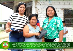 El alcalde de la municipalidad provincial de Zarumilla, dispuso la entrega de la mercadería que donó Aduanas a esta Comuna, y para ello se coordinó con la regidora Emily Del Pilar Chinguel Tocto, a fin de que se realice dicha acción en el sector “1 de Junio” del A.H. “28 de Julio” del distrito de Aguas Verdes. Los vecinos beneficiados, agradecieron el noble gesto de nuestra primera autoridad edil, a quien le reconocieron la labor que viene desarrollando en favor de las familias más necesitadas de la provincia.