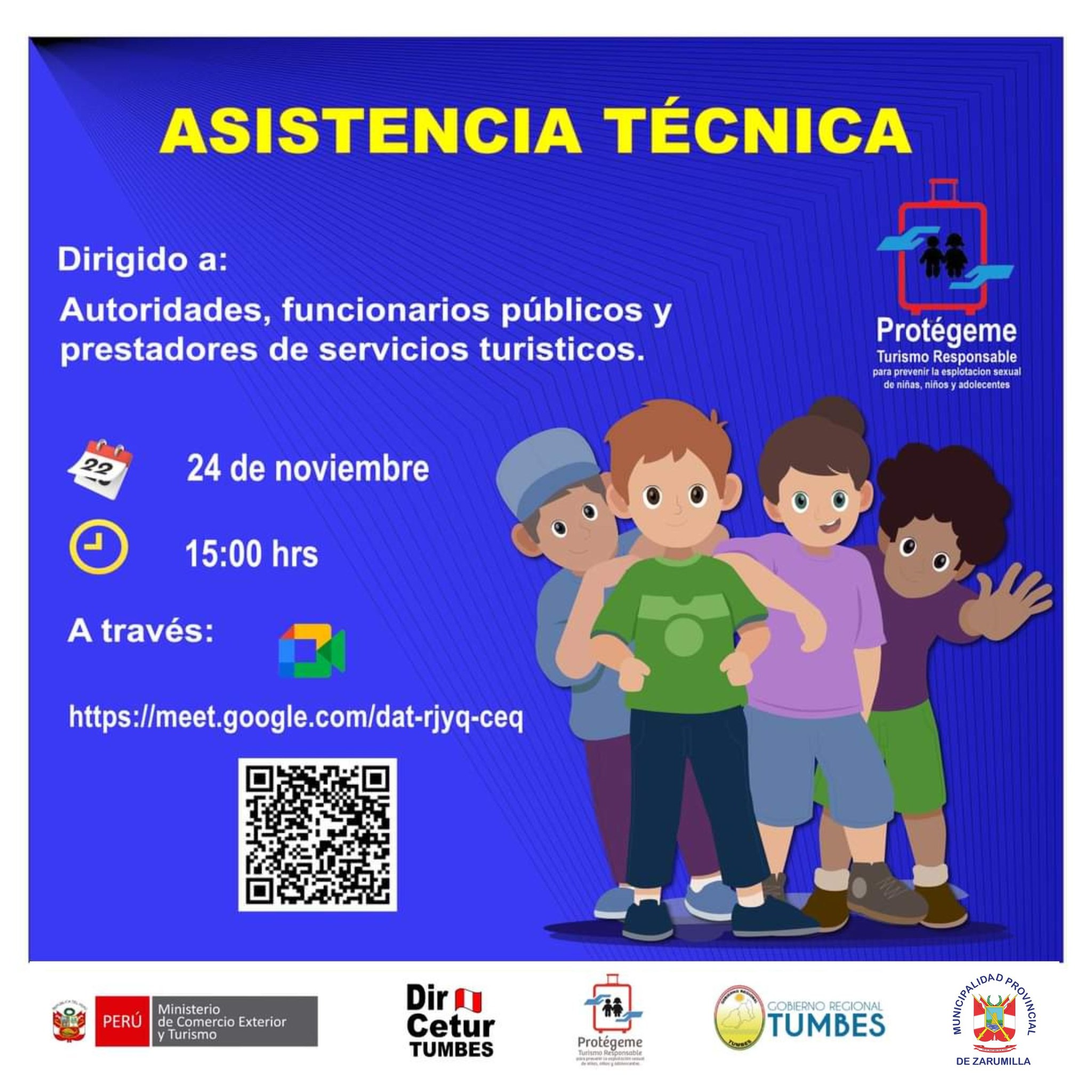 La Municipalidad Provincial de Zarumilla, te invita a participar de esta Capacitación Virtual «Sobre la explotación sexual de niños, niñas y adolescentes» – ESNNA, organizada por la Dirección Regional de Comercio Exterior y Turismo de Tumbes. Este importante evento, se realizará el día Viernes 24 de noviembre 3:00 p.m., dirigido a autoridades regionales y locales, funcionarios y prestadores de servicios Turísticos. Mayores informes al link:: https://meet.google.com/dat-rjyq-ceq