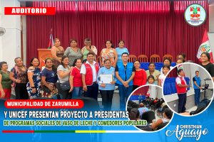En el marco de su compromiso con el bienestar social y el fortalecimiento de las comunidades, la Municipalidad Provincial de Zarumilla, en colaboración con el Fondo de las Naciones Unidas para la Infancia (UNICEF), presentaron el proyecto denominado: «Soporte psicosocial a niños, niñas y adolescentes y sus padres, madres, cuidadores y cuidadoras; y promoción de la crianza positiva con enfoque transformador de género en Lima, Piura y Tumbes» dirigido a las presidentas de los programas sociales de Vaso de Leche y Comedores Populares.