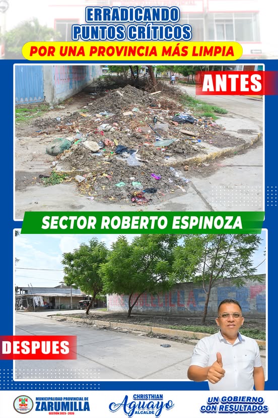 👏Gracias a las gestiones realizadas presidente de la Comisión de Gestión Ambiental de la Municipalidad Provincial de Zarumilla, el regidor Danny Sánchez Medina, se ha logrado la limpieza y el saneamiento de un punto crítico en el sector Roberto Espinoza, eliminando un importante foco de insalubridad y transformando el área en un entorno más seguro y saludable. Para evidenciar los resultados de este trabajo, se presentan fotos comparativas del antes y después de las intervenciones, demostrando de manera clara el impacto positivo de las acciones realizadas.