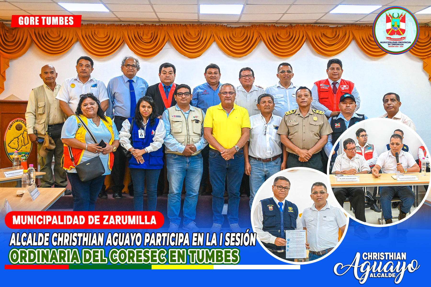 ✅ El alcalde provincial de Zarumilla, Abg. Christhian Aguayo Infante, participó en la I Sesión Ordinaria del Comité Regional de Seguridad Ciudadana (CORESEC), donde se llevaron a cabo importantes actividades, entre ellas la juramentación de nuevos miembros del CORESEC y la entrega de reconocimientos a ponentes y participantes del Plan de Fortalecimiento de Capacidades de Serenos de la Región Tumbes.