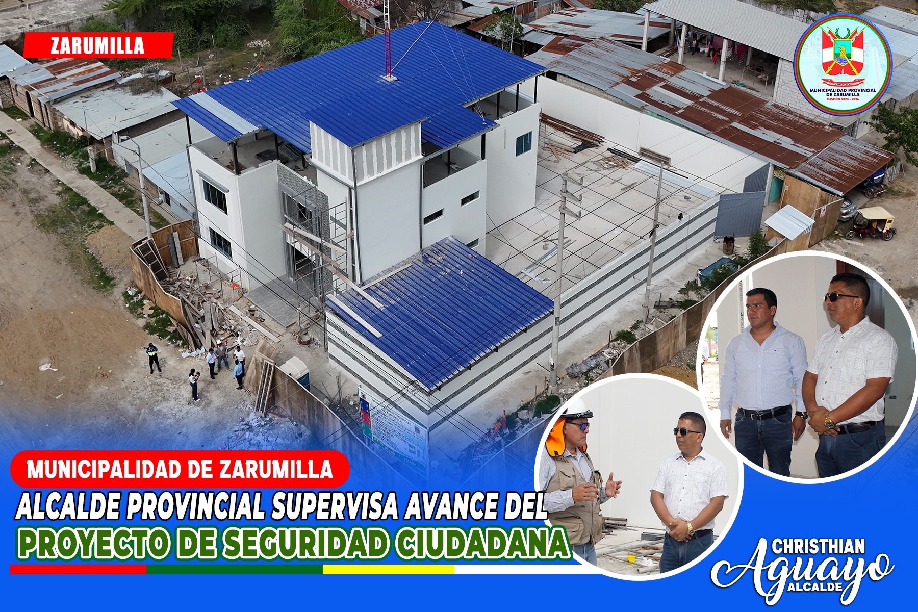 ✔ El alcalde de la Municipalidad Provincial de Zarumilla, Abg. Christhian Aguayo Infante, junto al regidor vicepresidente de la Comisión de Obras, Danny Sánchez Medina; el gerente de Infraestructura, Ing. Fernando Aldea y el subgerente de Gestión de Riesgos de Desastre, Abg. Abel Alvarado, realizaron una visita inopinada para supervisar el avance del proyecto de seguridad ciudadana, el cual se encuentra al 95% de ejecución y se inaugurará en los próximos meses.