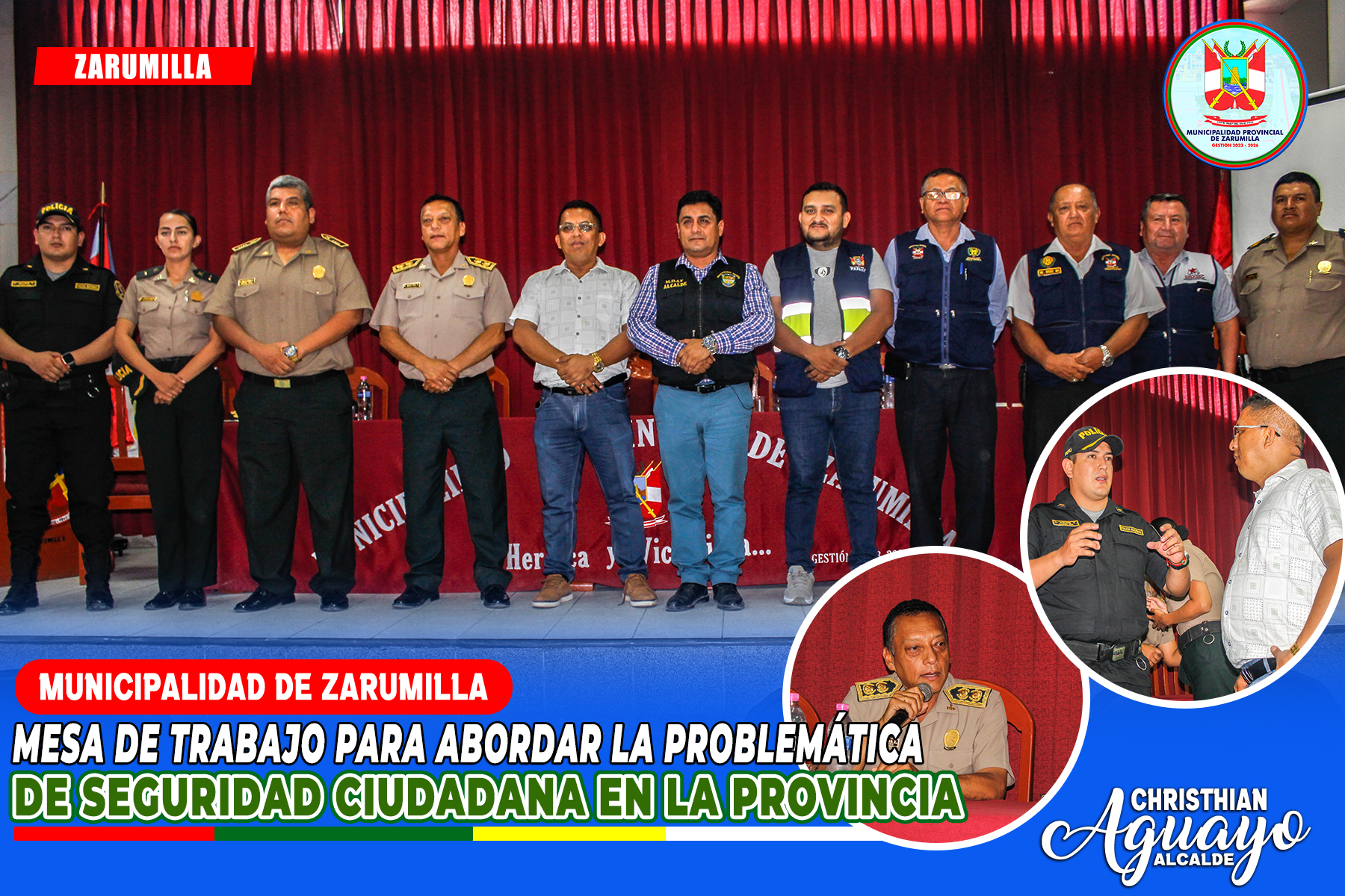 ✔ Durante la reunión, se abordaron los principales desafíos en materia de seguridad, como el aumento de delitos y la escasez de recursos para enfrentarlos. Se acordaron acciones coordinadas, como el refuerzo de los operativos policiales y el fomento de la participación ciudadana en la prevención del delito. Asimismo, el alcalde provincial, Abg. Christhian Aguayo Infante, destacó su compromiso de dar seguimiento continuo a los avances de las medidas adoptadas y coordinar nuevos encuentros para evaluar los resultados y ajustar las acciones necesarias.