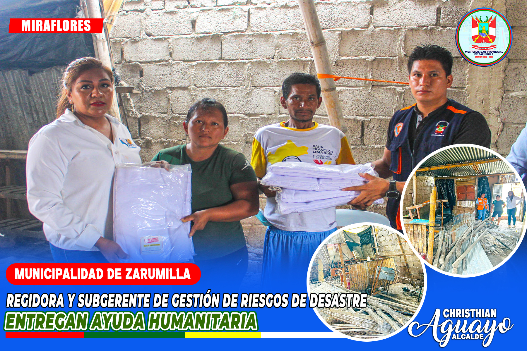 鉁匧a regidora de la Municipalidad Provincial de Zarumilla, Juvitza Nole Infante, y el subgerente de Gesti贸n de Riesgos de Desastre entregaron ayuda humanitaria a una familia de la calle Loreto, en el sector Miraflores, cuya vivienda colaps贸 debido a las lluvias que afectaron la regi贸n. La ayuda incluy贸 utensilios de cocina, s谩banas, baldes y materiales para la reconstrucci贸n temporal del hogar.