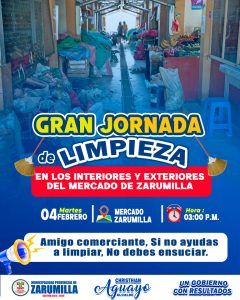 ¡Amigo comerciante! Si no ayudas a limpiar, no debes ensuciar. La Municipalidad Provincial de Zarumilla, a través de la jefatura de Mercado Municipal, realizará una jornada de limpieza en los interiores y exteriores del Mercado de Abastos.
