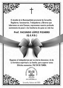 El alcalde de la Municipalidad Provincial de Zarumilla, Abg. Christhian Aguayo Infante, plana de regidores, funcionarios y trabajadores, con profundo dolor y respeto, expresan su más sincero pésame por el lamentable fallecimiento del Prof. FACUNDO LÓPEZ PIZARRO, En este momento de dolor, nos unimos en oración con su familia y seres queridos, elevando nuestras plegarias para que encuentren fortaleza y consuelo ante tan irreparable pérdida.