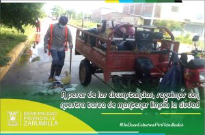 A pesar de la temporada de lluvia que venimos atravesando, nuestro personal de limpieza pública, se desplaza por los diferentes sectores de la ciudad con la única misión de mantenerla limpia y ordenada. Nos toca ahora, como vecinos, ayudar a mantener el ornato de nuestras calles y avenidas. ¡JUNTOS HAREMOS DE ZARUMILLA, UNA CIUDAD LINDA PARA VIVIR!