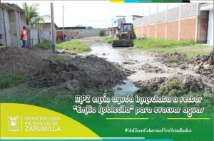 Gracias a las coordinaciones realizadas por nuestro alcalde provincial y a pedido de los vecinos del sector «Emilio Noblecilla» quienes solicitaron el apoyo con maquinaria para realizar trabajos que permitan la evacuación de aguas pluviales, las mismas que se encontraban estancadas y no permitían el libre tránsito de peatones, especialmente a los niños en edad escolar, que ante esta situación corrían el riesgo de perder clases en sus respectivas instituciones educativas. Inmediatamente, se dispuso el envío de maquinaria pesada a este populoso sector de la ciudad, para poder lograr el discurrir de las aguas producto de las lluvias. De esta forma, nuestra Comuna atiende a los sectores que sufren las consecuencias de la temporada de lluvias que afecta a toda la provincia.
